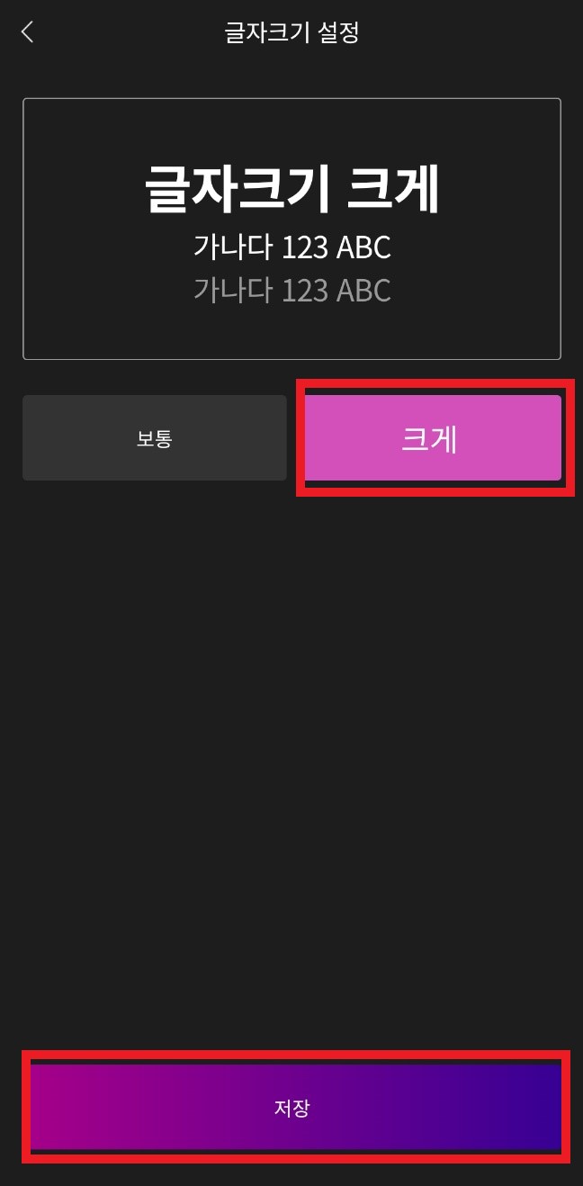 하단에 My를 클릭하시면 내 이벤트 참여내역 및 댓글 등을 확인하실 수 있고 글자크기를 설정할 수 있습니다. 글자 크기를 클릭 하셔서 크게를 선택하시고 아래 저장을 클릭해 주시면 됩니다.
