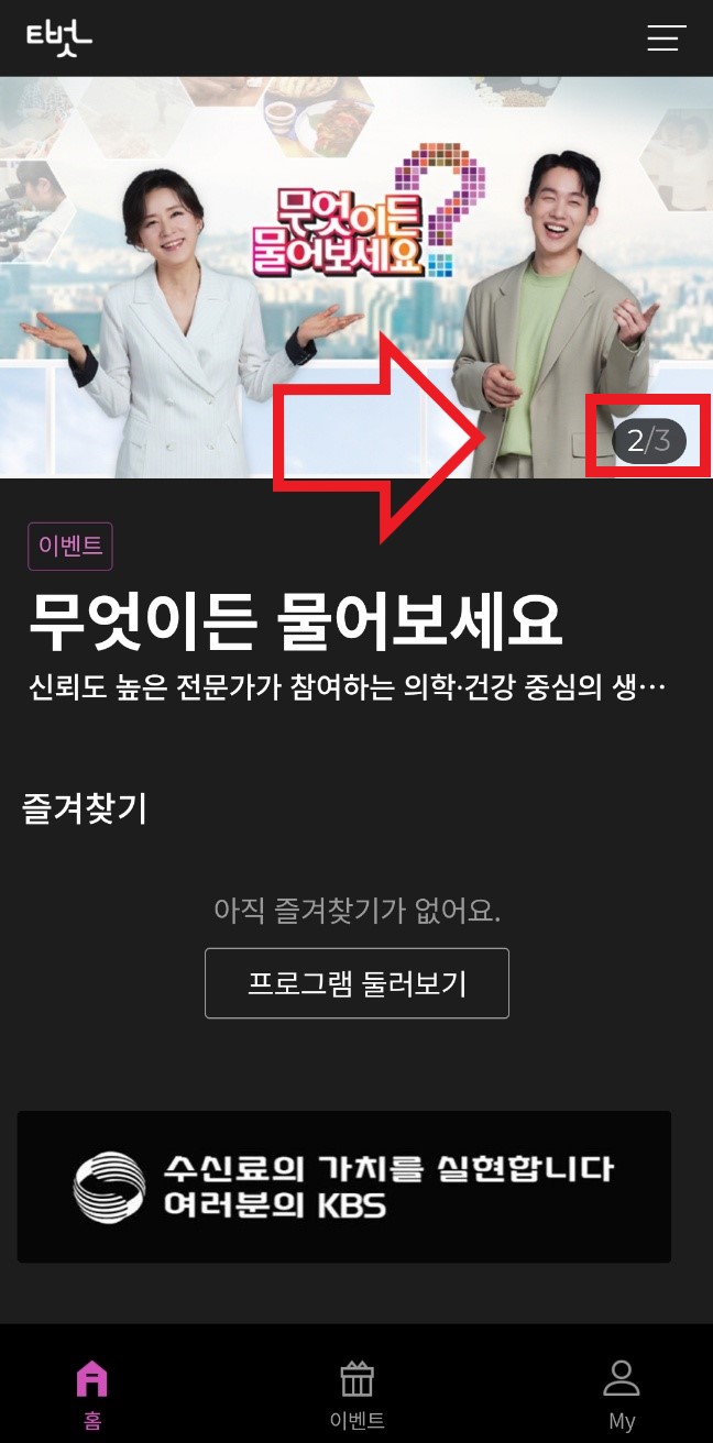 4번 화면에서 하단에 이벤트를 클릭해 보세요. 아침 마당 및 무엇이든 물어보세요 방송 이벤트를 참여 하실 수 있습니다. 저도 부모님께 알려드렸더니 엄청 신기해하시고 자주 참여하시고 계십니다.