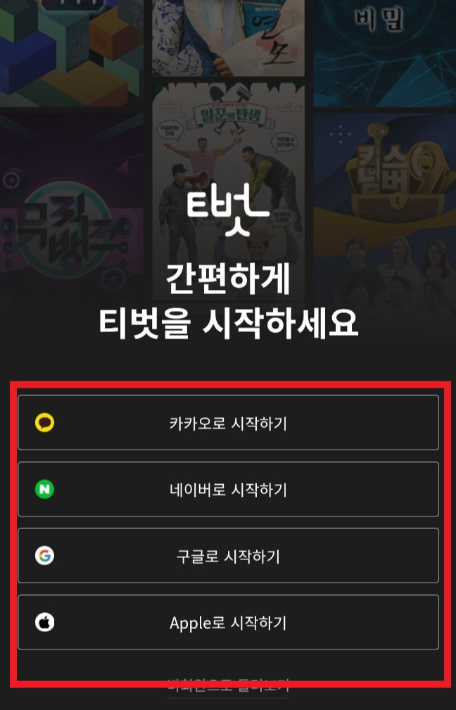 카카오, 네이버, 구글 등 본인이 자주 사용하시는 것으로 시작하기를 클릭하시면 간편하게 로그인 하실 수 있습니다.
