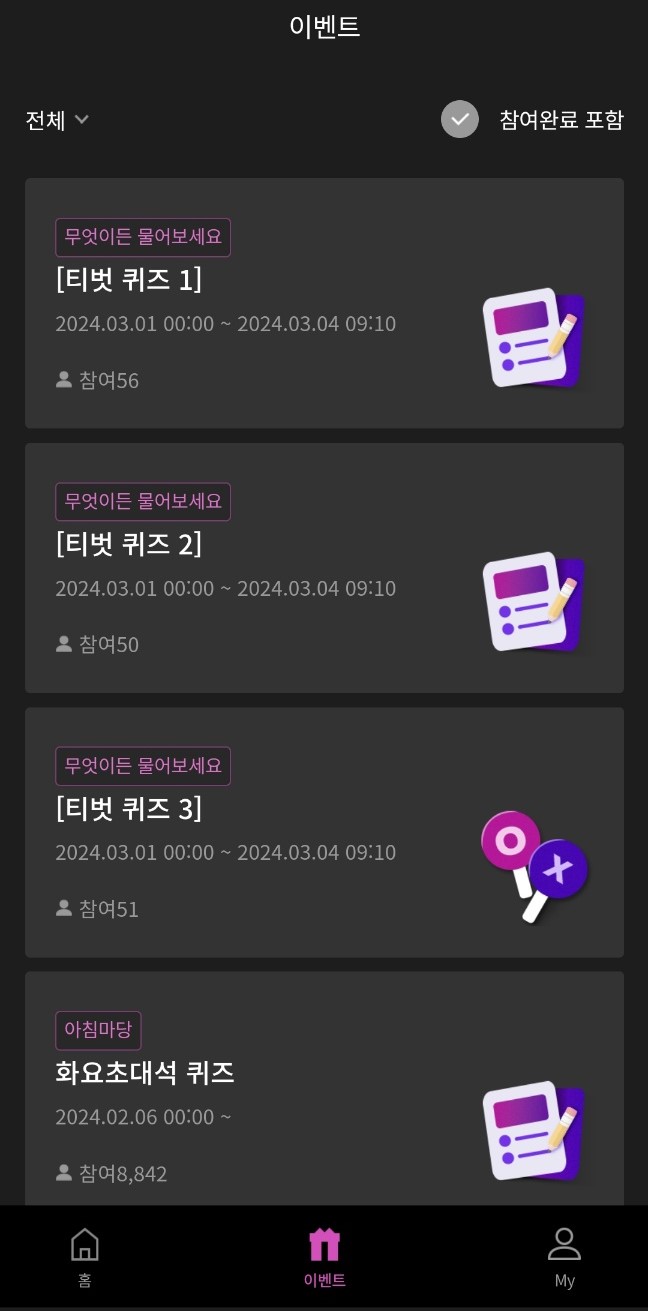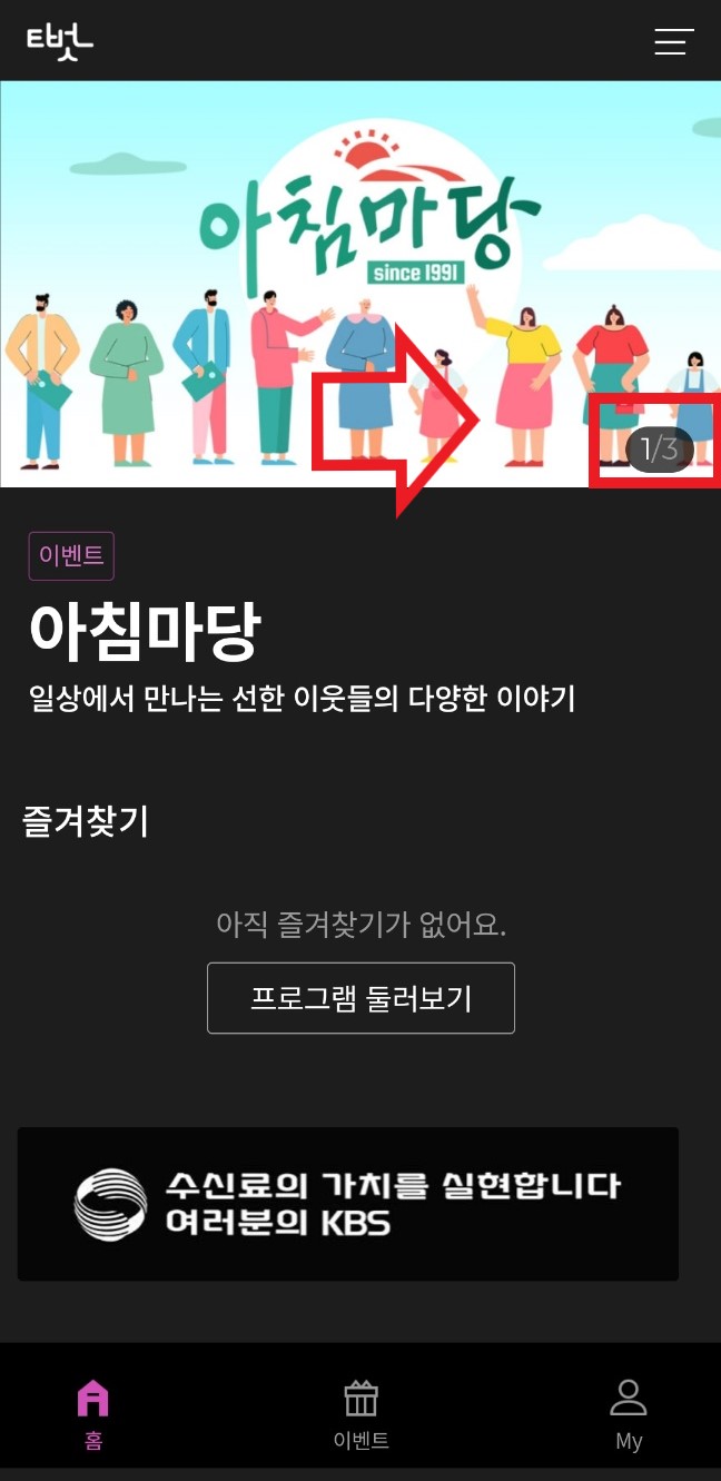 4번 화면에서 하단에 이벤트를 클릭해 보세요. 아침 마당 및 무엇이든 물어보세요 방송 이벤트를 참여 하실 수 있습니다. 저도 부모님께 알려드렸더니 엄청 신기해하시고 자주 참여하시고 계십니다.