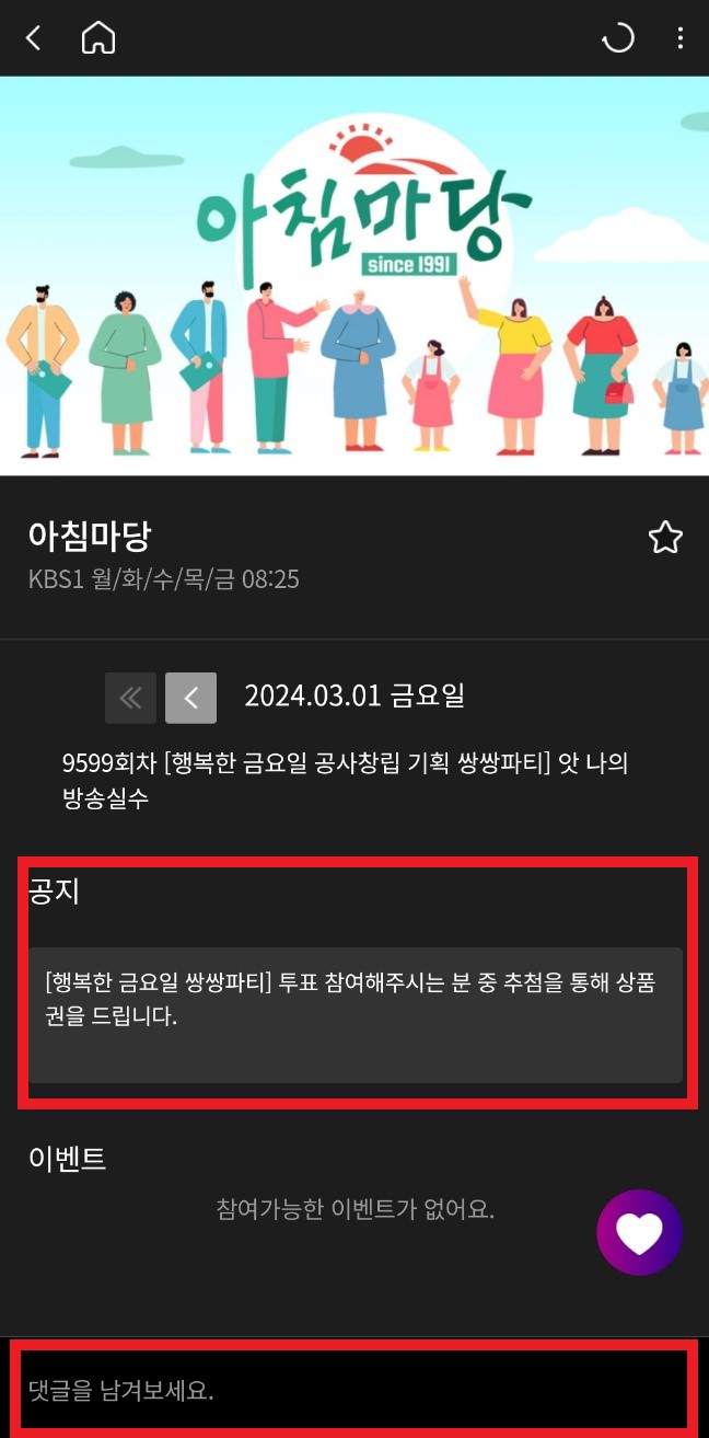 4번 위의 화면에서 아침마당 이미지를 클릭하시면 아래와 같이 아침마당 전용 화면으로 움직이게 됩니다. 여기에서 기본공지를 확인할 수 있고 실시간으로 댓글을 남기실 수 있습니다. 이벤트가 열리면 이벤트 내용도 뜨니 관심 있으면 클릭해서 참여하시면 됩니다.
