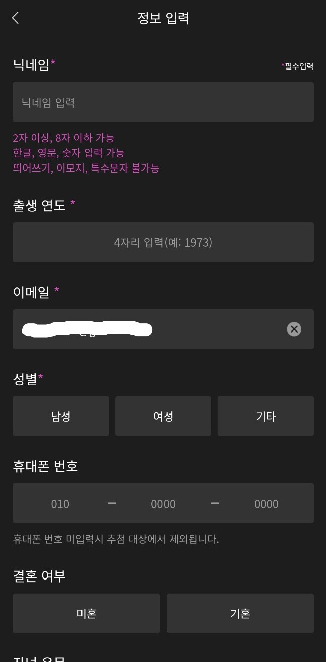 닉네임과 출생 연도, 이메일 주소, 성별 등을 입력하세요. 휴대폰 번호는 입력하지 않으셔도 되지만 이벤트 및 추첨 대상에서 제외되기 때문에 입력하시는 것을 추천드립니다. 그 밑에 결혼, 자녀 유무는 굳이 선택 안 하셔도 됩니다.