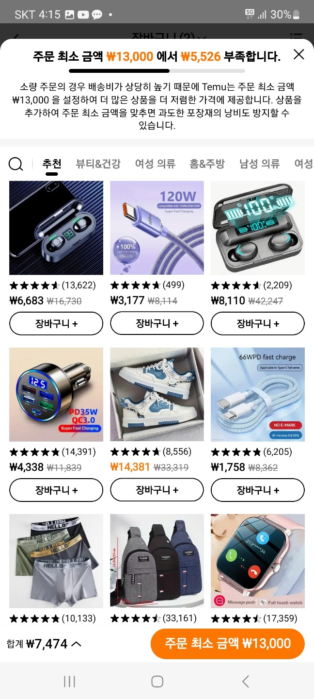 ✅ 4. 장바구니에 잘 담겨있는지 확인하고 총금액을 확인하셔야 합니다. 테무 쇼핑몰 최소 주문금액이 13000원입니다.